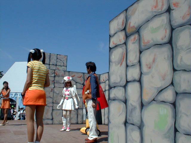 ロビーナ&風見志朗 豪華2ショット(左の写真、左からロボコンショーの司会のお姉さん、ロボコン、ロビーナちゃん、風見志朗、ショッカーの人質)
